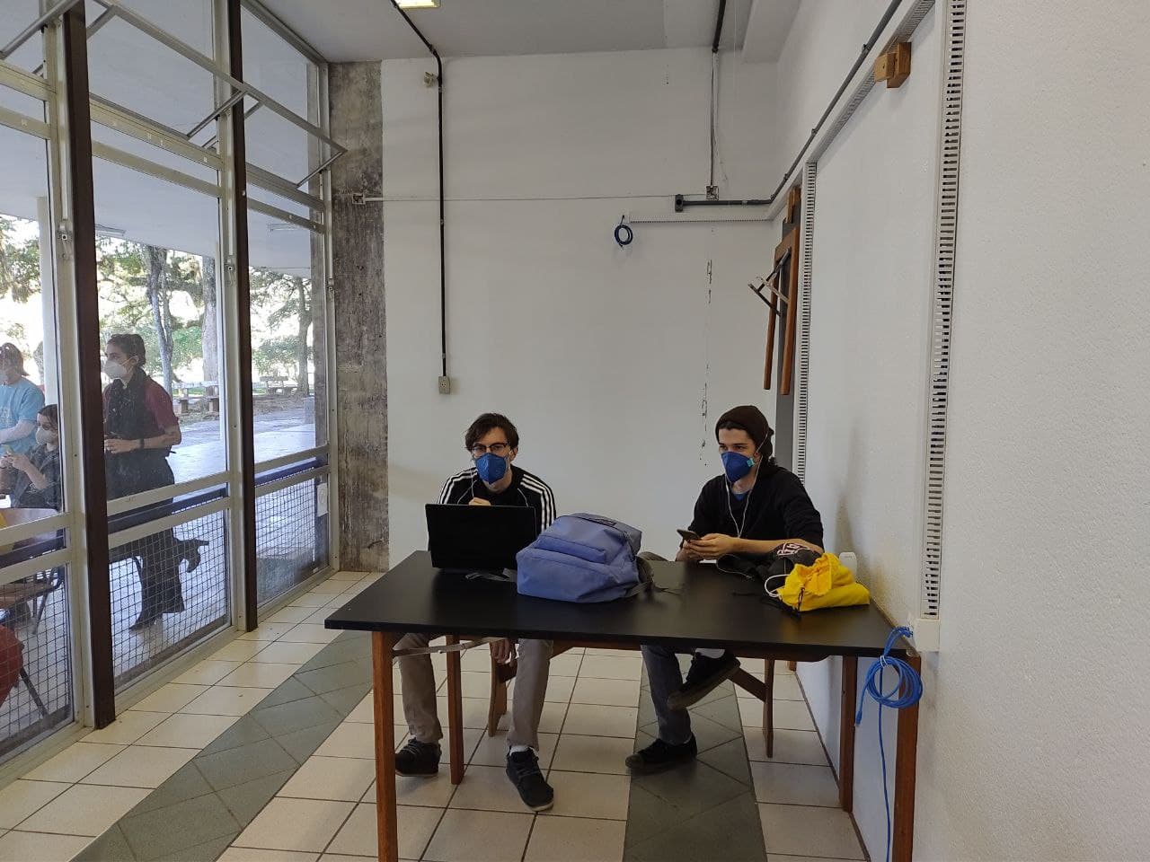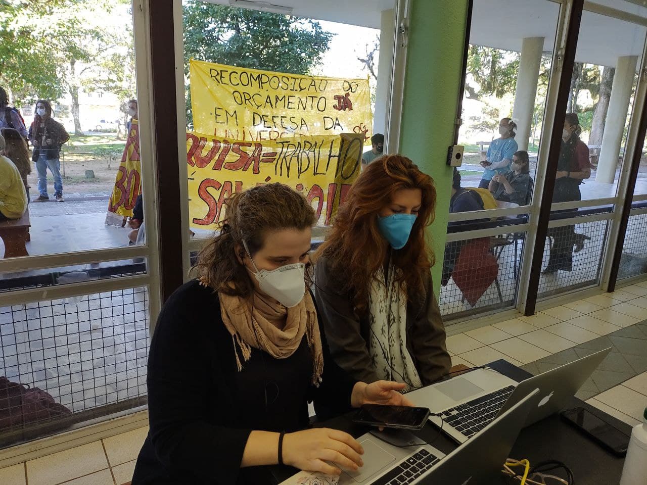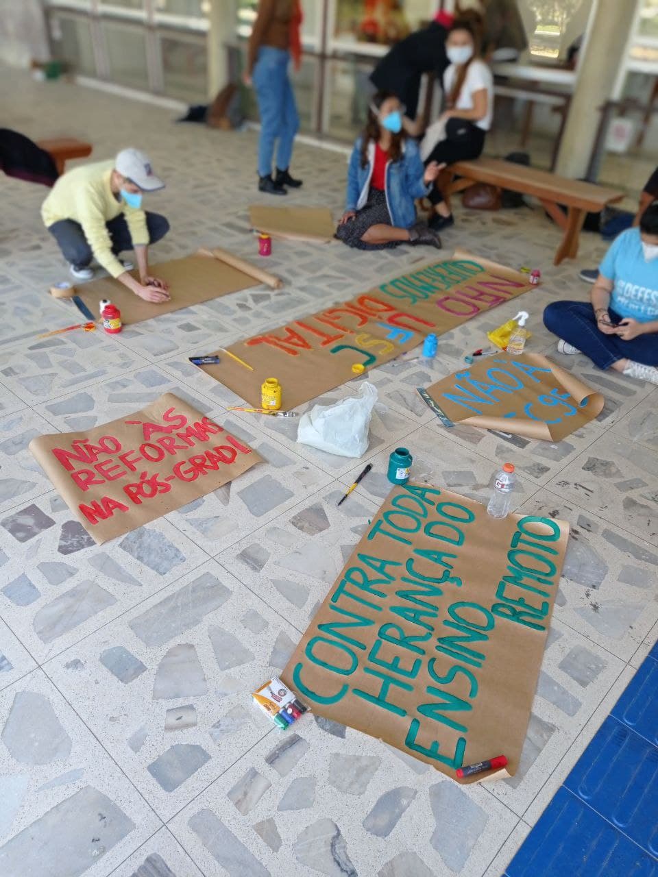 13h27 Estudantes da graduação e pós-graduação realizam concentração para o ato, no varandão do CCE. Estudantes realizam pintura de cartazes e preparam os equipamentos para acompanharem a transmissão do Conselho Universitário