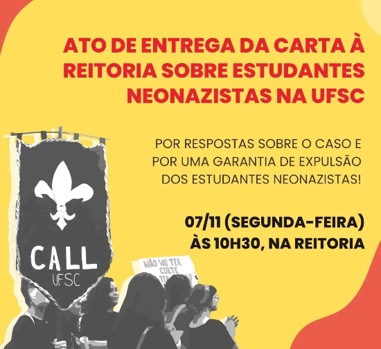 Diante das diversas manifestações encontradas pela universidade, o Centro Acadêmico Livre de Letras (CALL) convocou todos os CAs e o Diretório Central dos Estudantes (DCE) para uma reunião no feriado de 02 de novembro, na qual encaminhou-se a convocação de um ato de entrega de uma carta de cobrança de uma postura incisiva da reitoria sobre os estudantes neonazistas na UFSC. O ato ocorre em breve, às 10h30m na reitoria.