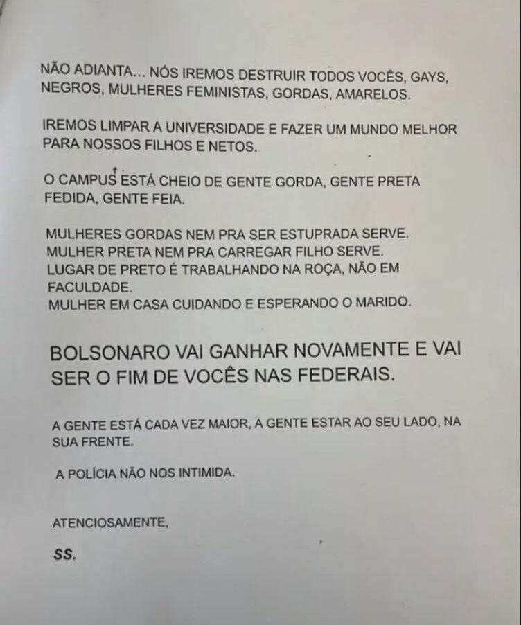 O Centro Acadêmico XI de Fevereiro (CAXIF), do curso de Direito, convocou um ato dia 26 de outubro contra as manifestações neonazistas e misóginas no CCJ e no dia seguinte (27), foi encontrada uma carta repleta de expressões de ódio no Centro de Ensino, com ameaças, apoio ao presidente Jair Bolsonaro e assinatura da SS, sigla que faz referência à organização paramilitar do partido de Adolf Hitler, o Esquadrão de Proteção (Schutzstaffel).