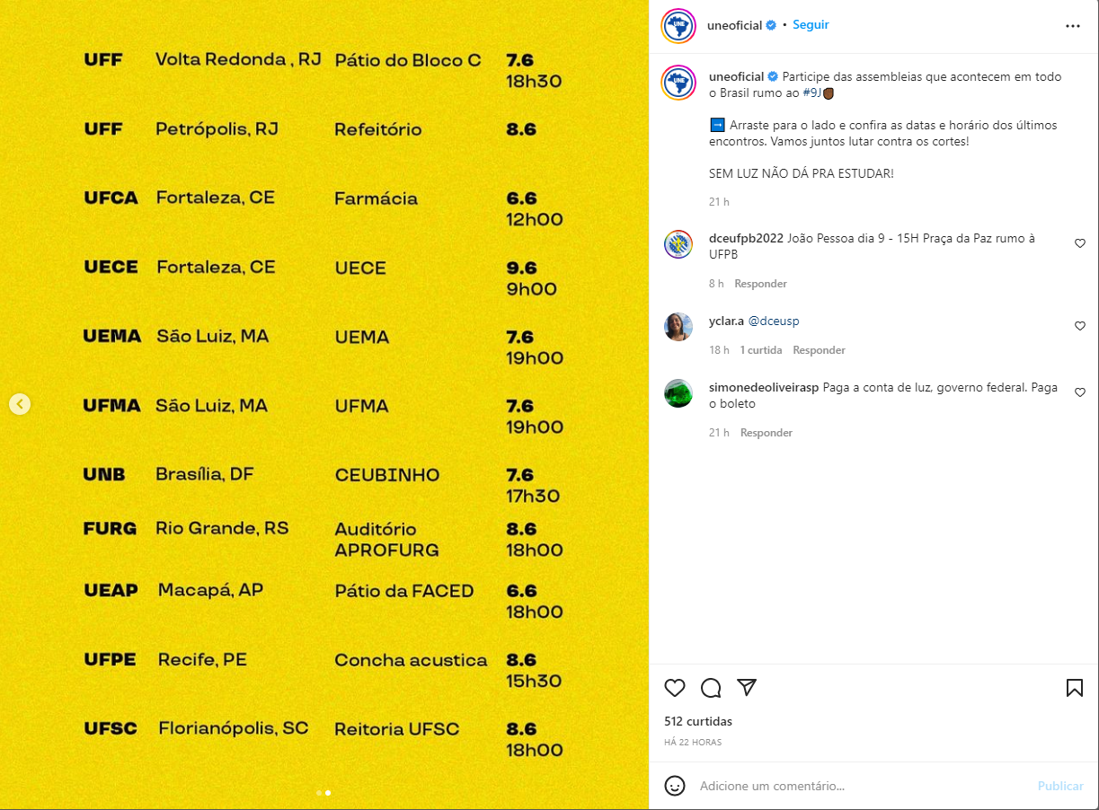 Assembleias e plenárias vêm ocorrendo nas IFEs desde que essas medidas de ataque à universidade pública vieram a público. E em decorrência dessas movimentações, está sendo convocado pela União Nacional dos Estudantes (UNE) um ato nacional no dia 09 de julho.