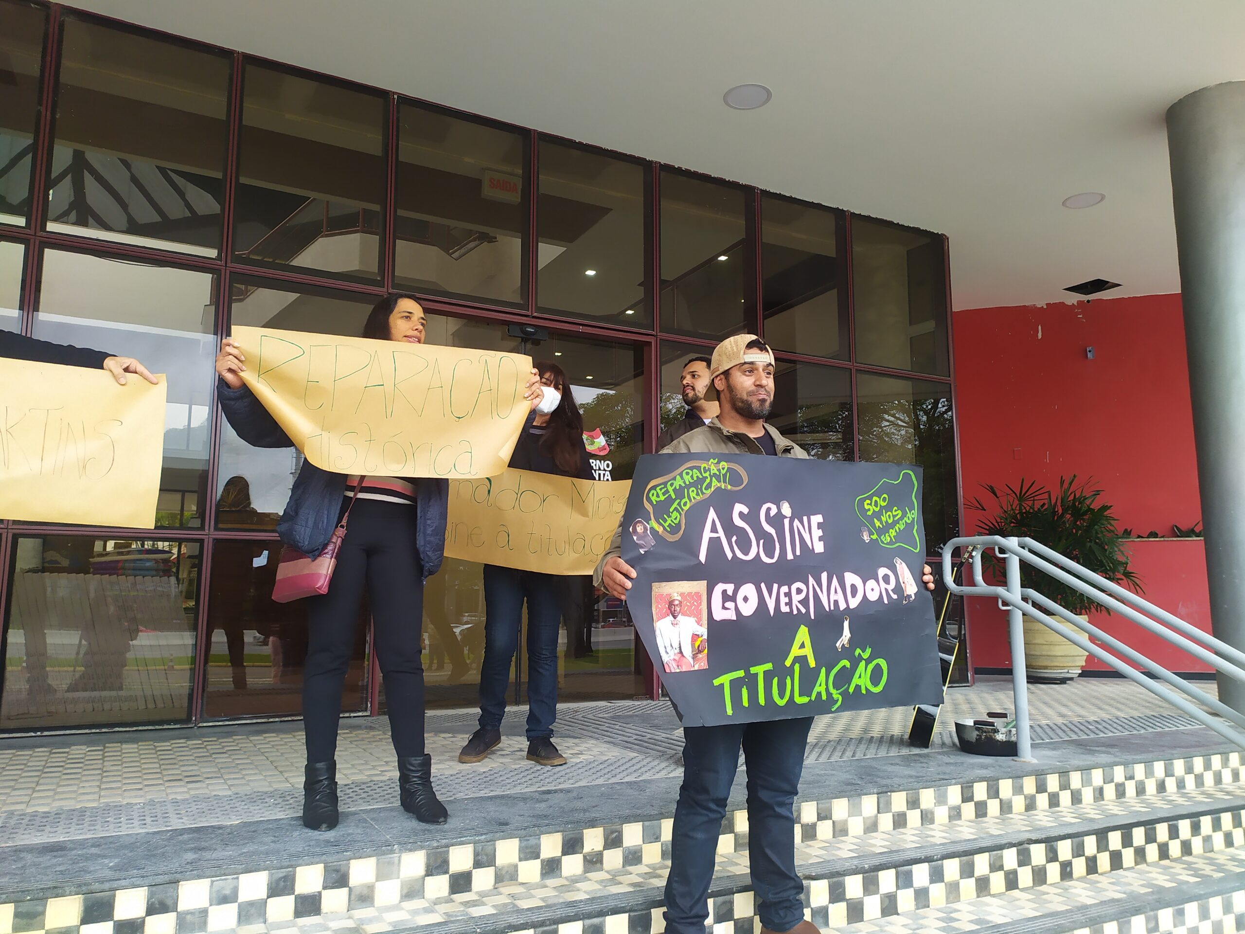 Na tarde de ontem (17/08), manifestantes se reuniram em frente ao Centro Administrativo do Estado de Santa Catarina para reivindicar a titulação do território quilombola Vidal Martins, localizado no bairro Rio Vermelho, em Florianópolis. A comunidade é a primeira regularizada pelo Instituto Nacional de Colonização e Reforma Agrária (INCRA) no município, de acordo com a Portaria nº1.511, publicada em 21 de julho de 2022 no Diário Oficial da União. O ato foi organizado pelas lideranças e moradores do quilombo, exigindo a assinatura do governador Carlos Moisés. Há quatro anos a comunidade luta pelo acesso ao direito de regularização e não consegue uma audiência com o governador.