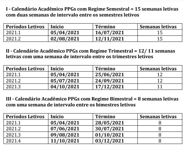 Para a pós-graduação, haverá um número variável de semanas letivas que poderão ser decididas em cada colegiado de pós-graduação. As datas e recessos também irão variar em razão de o programa ser semestral, trimestral ou bimestral. Os programas também têm autonomia para fazerem adaptações que se adequem ao calendário de 2020.2. Confira essas datas: