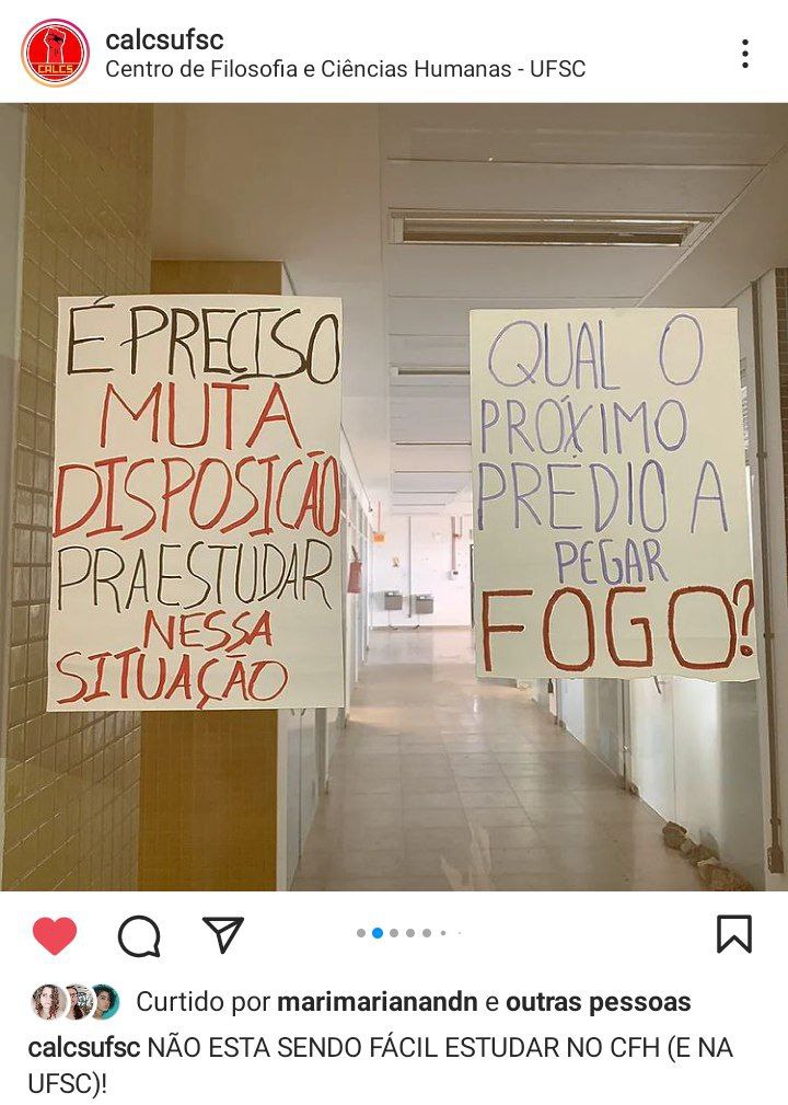 As aulas presenciais na Universidade Federal de Santa Catarina (UFSC) retornaram em 18 de abril. Desde estão, aqueles que estudam e trabalham no Centro de Filosofia e Ciências Humanas (CFH) têm sentido os efeitos do corte orçamentário nas universidades e consequente descaso com a infraestrutura da instituição.