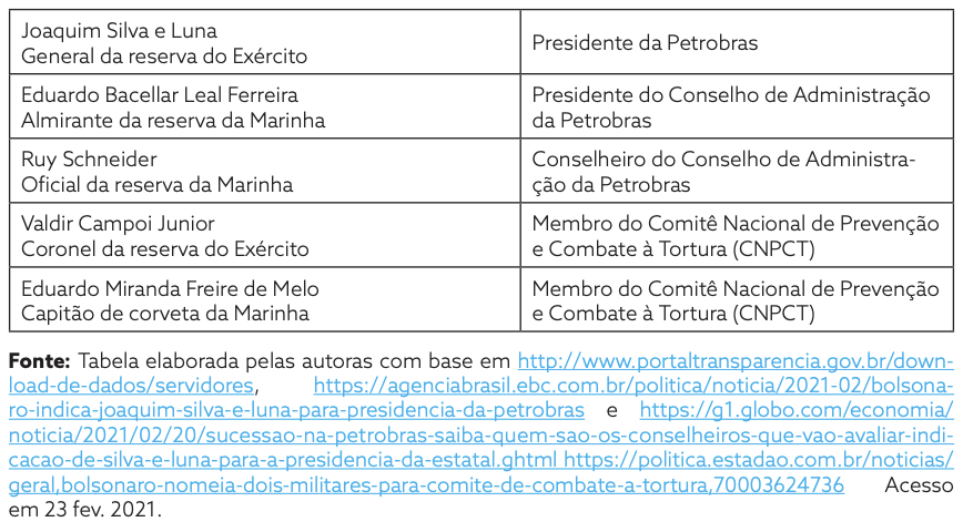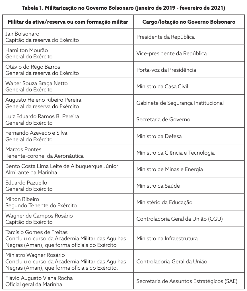 Os dados elaborados e examinados apresentam que atualmente os militares controlam oito dos 22 ministérios, além de outras áreas estratégicas do serviço público federal e de estatais. Confira mais detalhes na tabela a seguir: