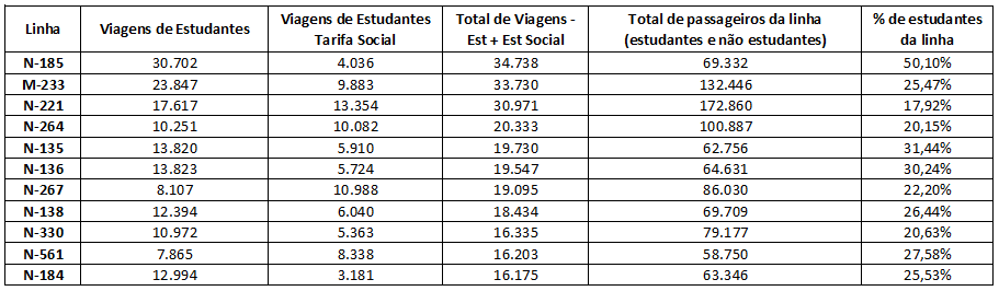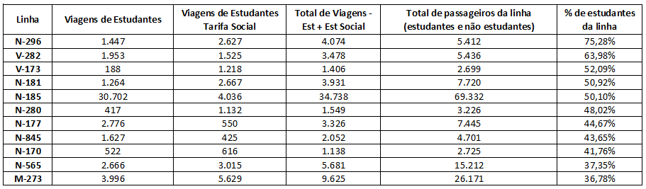 Tabela 1 – linhas com mais uso pelos estudantes em novembro de 2022