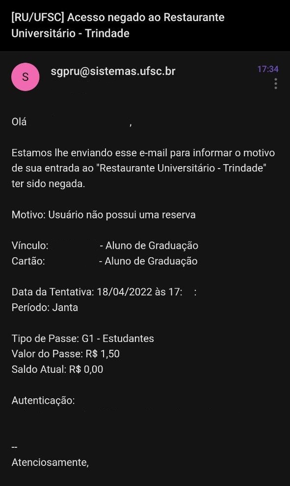 Ao passar a carteirinha na catraca, o estudante ou servidor recebe um e-mail com informações sobre a entrada. Em alguns casos, devido à falta de agendamento, a catraca não liberou o acesso de alguns estudantes na janta de segunda-feira (18).