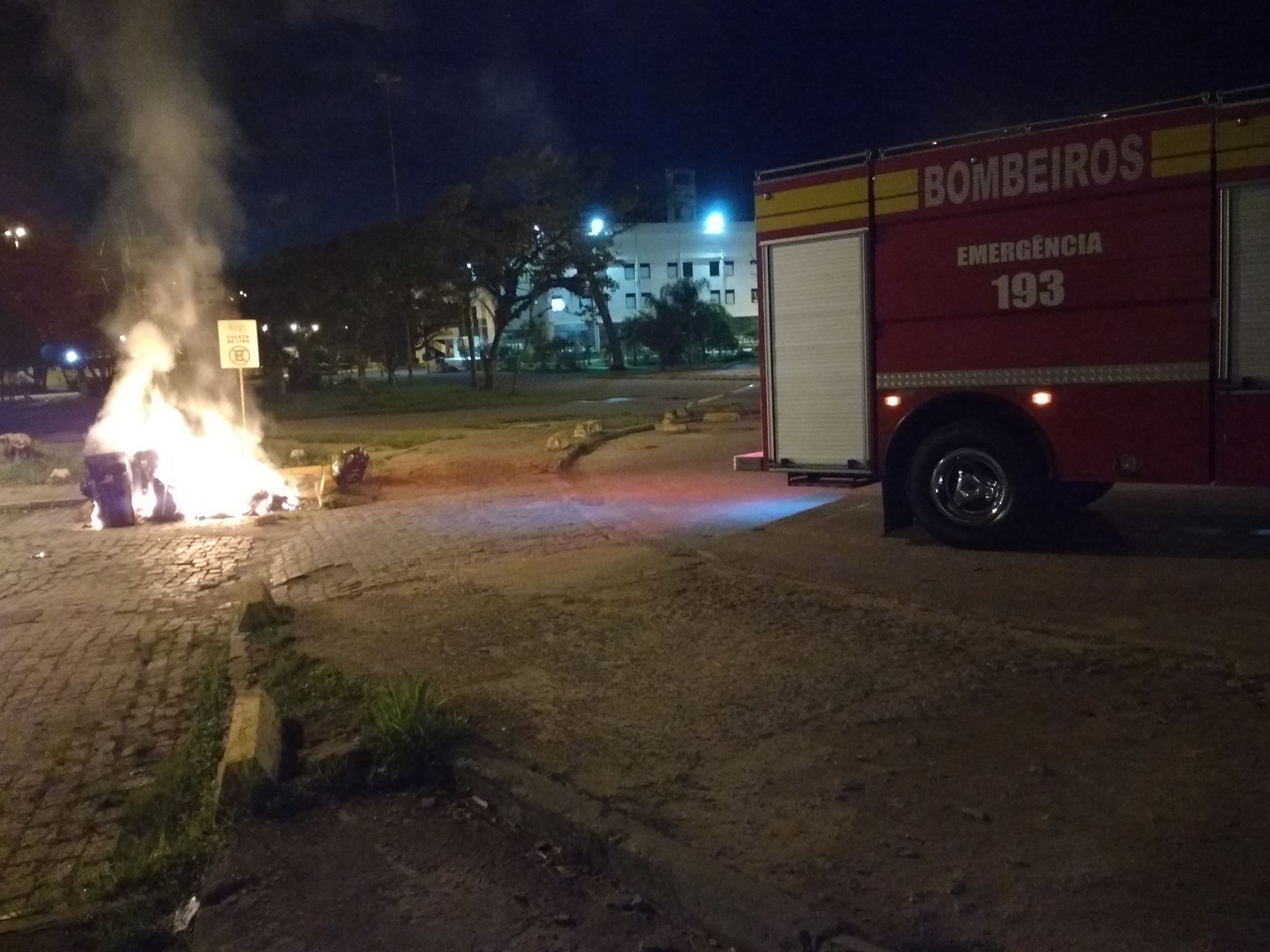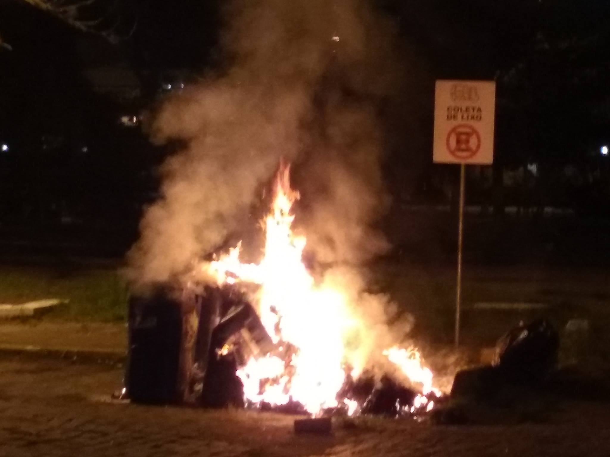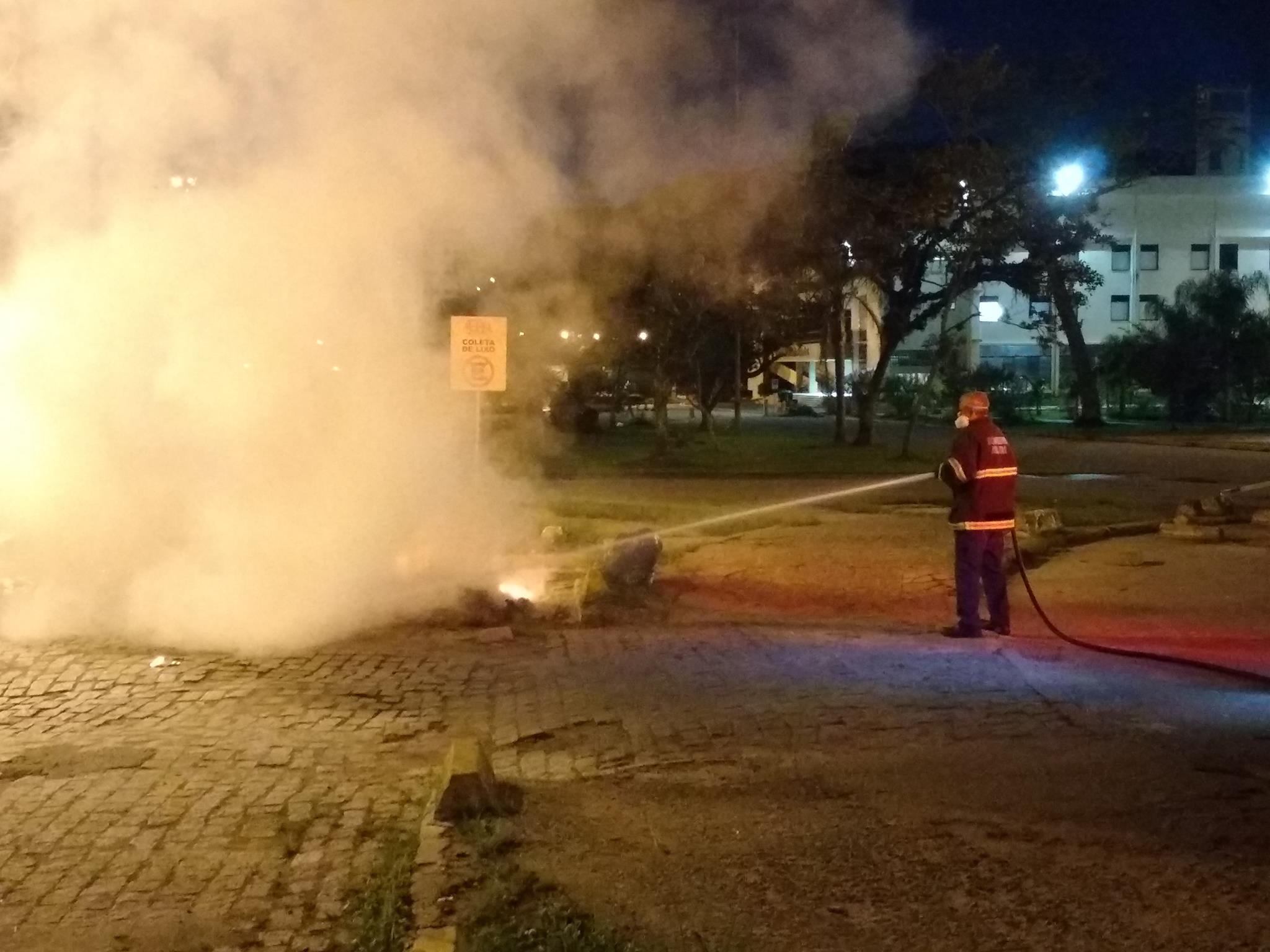 Foto: bombeiro apaga lixeira incendiada após a repressão policial; por estudante da UFSC