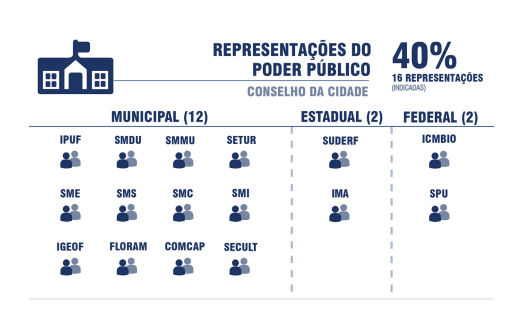 Ele é composto por 40 representações distribuídas em: 16 cadeiras do Poder Público (40%) e 24 da Sociedade Civil Organizada (60%). Esta última se divide entre Sociedade Civil Organizada de Abrangência Difusa e Sociedade Civil Organizada por Setores do Município, com distribuição de 12 cadeiras para cada. Veja abaixo quais são as entidades atualmente responsáveis pelas cadeiras: