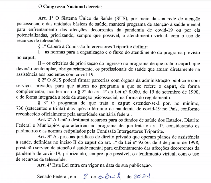Na última quarta-feira (07/04), o senado aprovou por unanimidade o Projeto de Lei 2083/2020 que visa criar no âmbito do Sistema Único de Saúde (SUS) um programa específico para acolhimento de pessoas em sofrimento psíquico . De autoria do senador Acir Gurgacz (PDT), o programa pretende mitigar eventuais impactos psicológicos decorrentes de políticas de isolamento social.