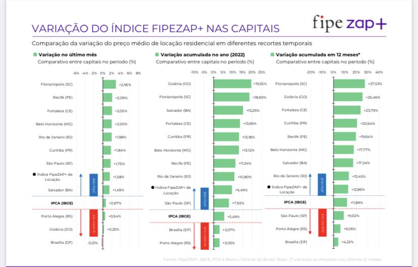 O último levantamento do índice da FipeZapde mostra a alta na especulação imobiliária refletida no preço dos aluguéis em 25 cidades do país destacando-se Florianópolis, uma das capitais com um dos maiores aumentos acumulados. Na tabela a seguir elaborada pela Fipe, Florianópolis lidera no ranking das variações acumuladas comparando com outras capitais, só ficando abaixo de Goiânia (GO) na variação acumulada para as locações desse ano: