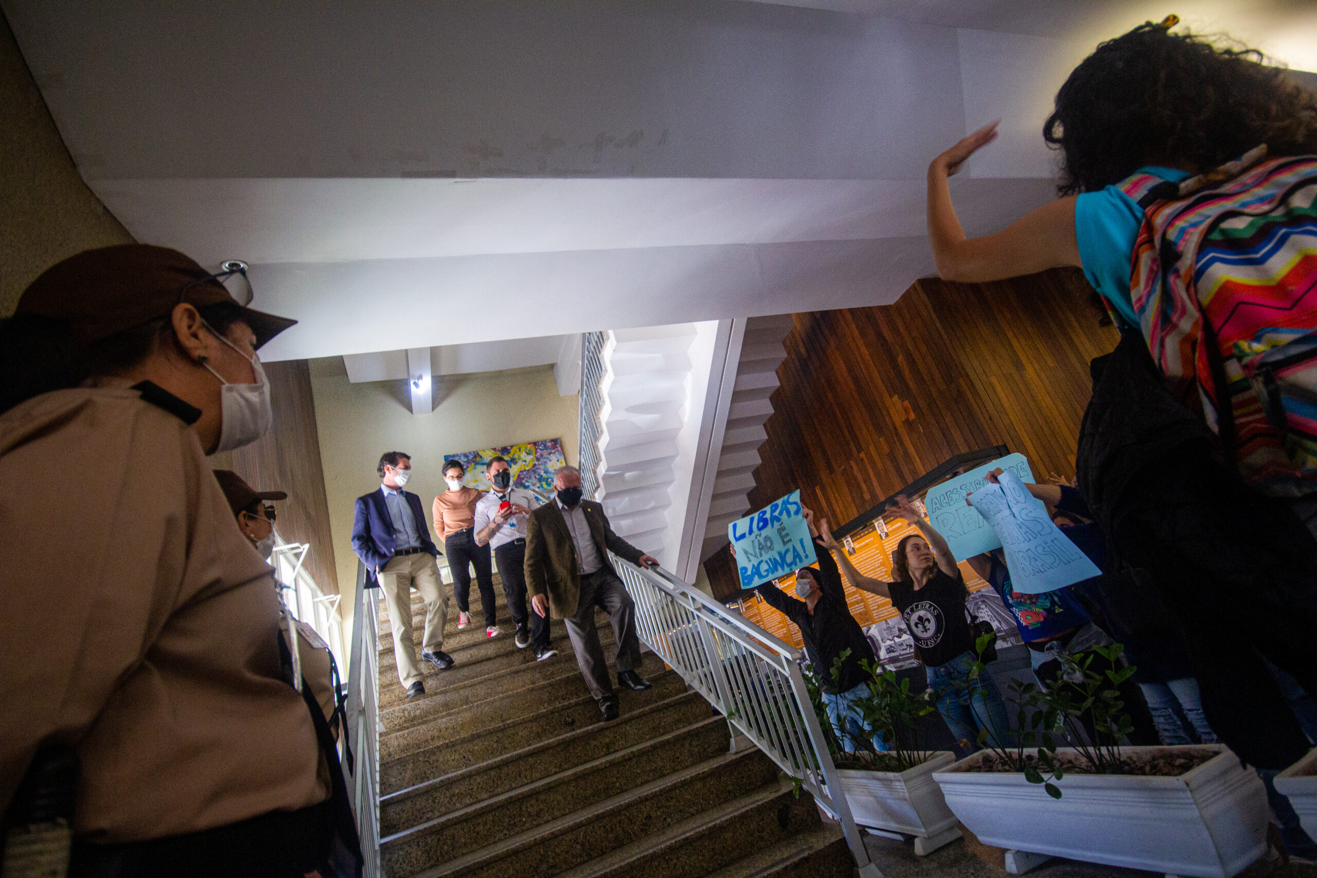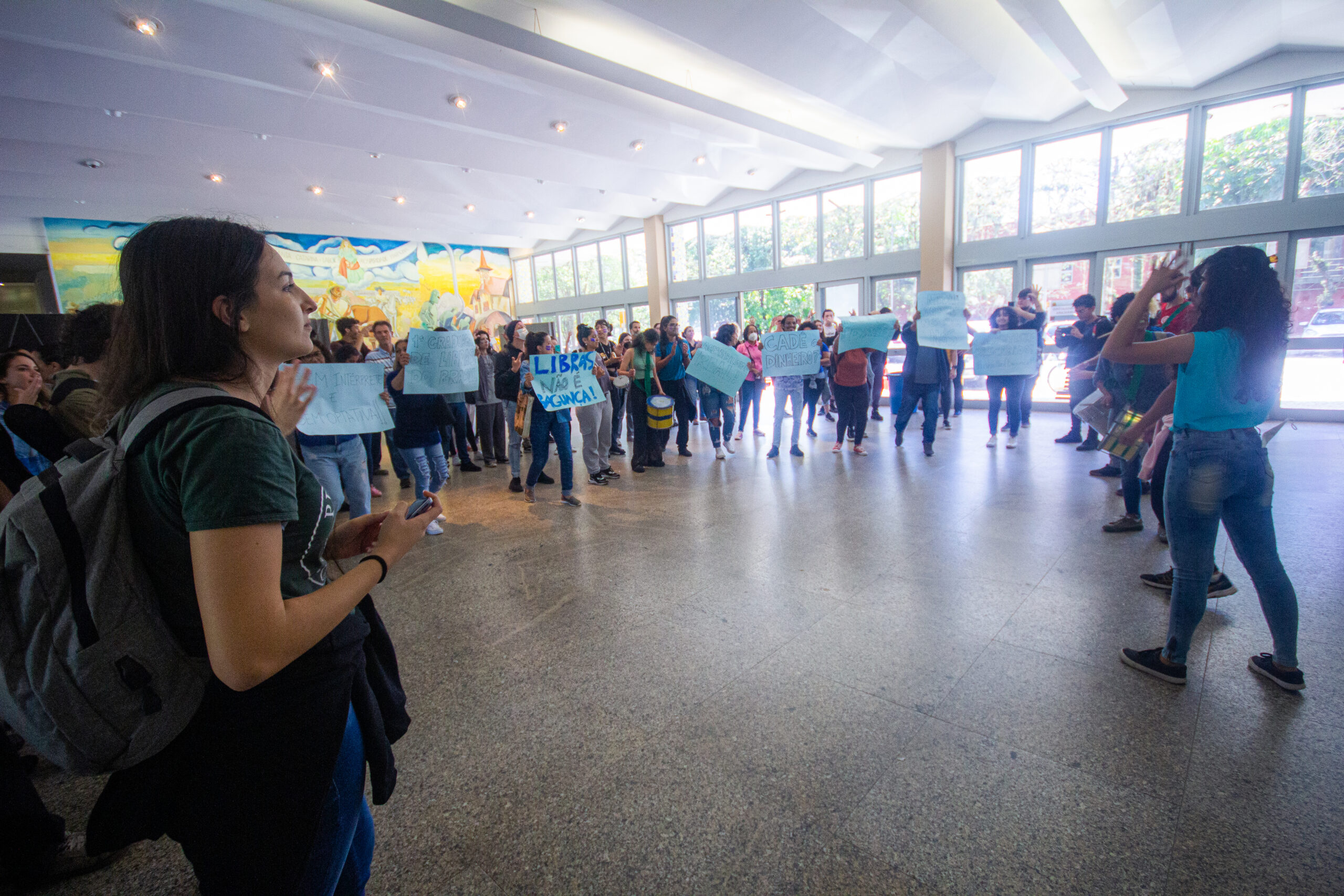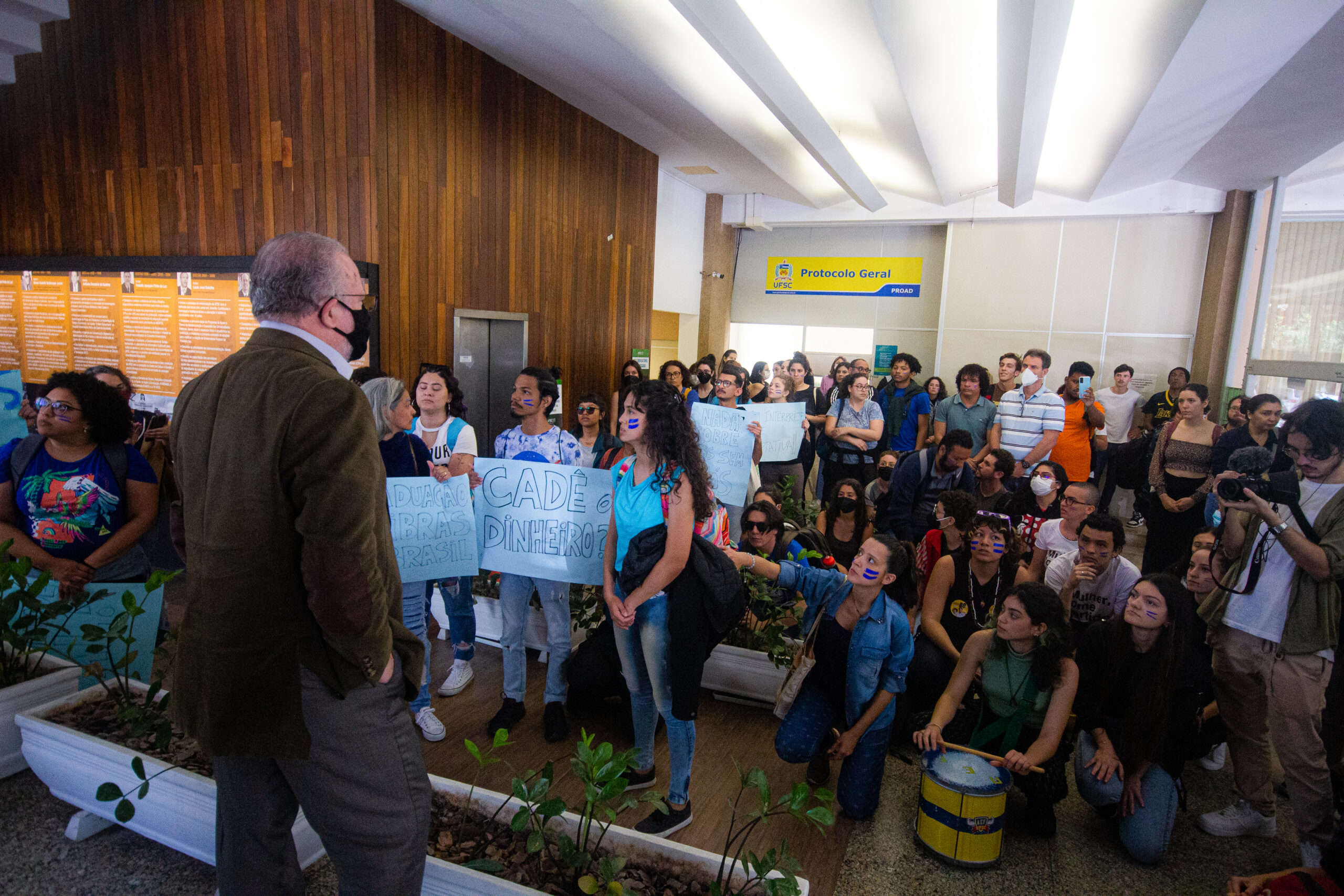 A multidão armada de cartazes, tambores, cultura e confiança, marchou do CCE até o hall do prédio da reitoria e então ficaram na escada que leva à sala do gabinete do reitor. Irineu Manoel de Souza, com uma equipe de intérpretes, demorou para descer, pois estava em uma reunião. Desculpou-se com essa justificativa e pediu para que, da próxima vez, os estudantes tentassem marcar horário. Parece que ele ainda não entendeu como as verdadeiras necessidades do povo são percebidas.